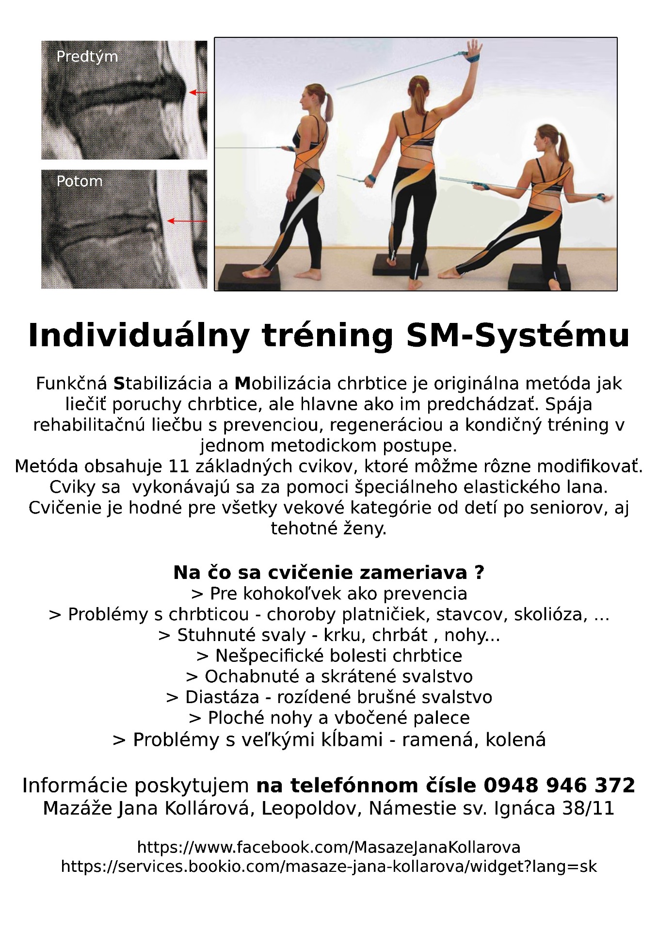 SM-SYSTEM Funkčná Stabilizácia a Mobilizácia chrbtice je originálna metóda jak liečiť poruchy chrbtice, ale hlavne ako im predchádzať. Spája rehabilitačnú liečbu s prevenciou, regeneráciou a kondičný tréner v jednom metodickom postupe. Tento jedinečný systém vznikol pod rukami bývalého športovca a renomovaného českého lekára MUDr. Richarda Smíška spolu s jeho dcérami MUDr. Kateřinou Smíškovou a MUDr. Zuzanou Smíškovou.